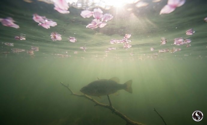 産卵直前のメスや、産卵を終えて一時的に体力を回復させようとしている個体は、シャローのすぐ隣にあるレイダウン(倒木)や立木に「サスペンド(浮遊)」します。彼らはボトムを意識しているようで、実は「中層」に浮いていることが多いのが4月の特徴です。